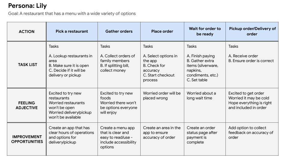 Mapping Lily’s user journey revealed how helpful it would be for users to have a dedicated app for looking up and ordering food.