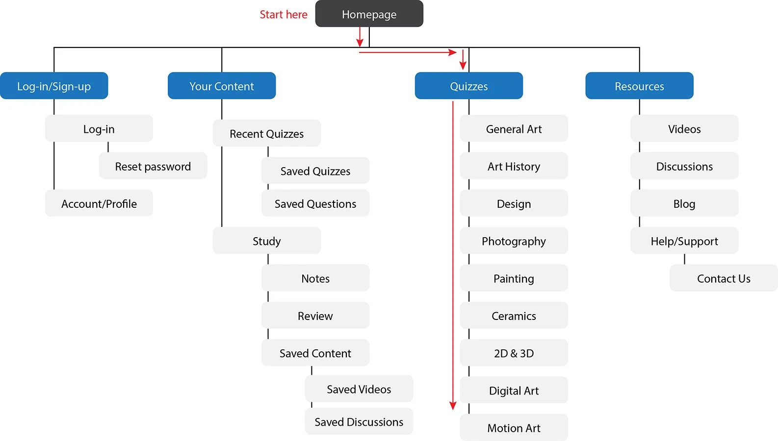 The site map was created to improve overall website navigation. I tried to make decisions for the site map to make things simple and easy.